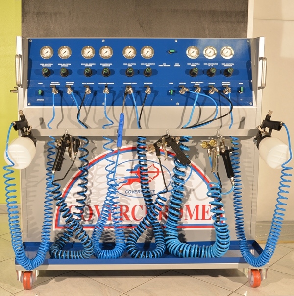 | Our machine for plating is composed of a sturdy structure, designed to allow an easy and immediate use. It consists of all the workstations, from the primer to the final transparent and has an additional attack for additional gun. It can empty and wash all the hoses and guns after use and make them readily available for the next cycle. Coverchrome relies on the advice and support of highly qualified technical staff, which with its constant commitment to research new technologies, ensures best results and always innovative, in compliance with environmental protection regulations of the European Community.